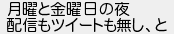 653: [] 2021/11/06(土) 07:48:10 月曜と金曜日の夜 配信もツイートも無し、と http://egg.5ch.net/test/read.cgi/streaming/1634967014/653