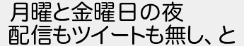 653: [] 2021/11/06(土) 07:48:10 月曜と金曜日の夜 配信もツイートも無し、と http://egg.5ch.net/test/read.cgi/streaming/1634967014/653