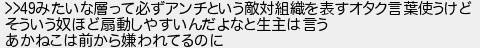 みたいな層って必ずアンチという敵対組織を表すオタク言葉使うけど そういう奴ほど扇動しやすいんだよなと生主は言う あかねこは前から嫌われてるのに