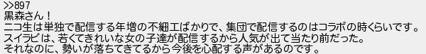 黒森さん! ニコ生は単独で配信する年増の不細工ばかりで集団で配信するのはコラボの時くらいです スイラビは若くてきれいな女の子達が配信するから人気が出て当たり前だった それなのに勢いが落ちてきてるから今後を心配する声があるのです