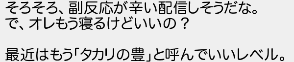 そろそろ副反応が辛い配信しそうだな でオレもう寝るけどいいの? 最近はもうタカリの豊と呼んでいいレベル