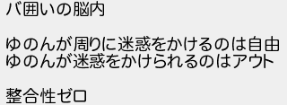 バ囲いの脳内 ゆのんが周りに迷惑をかけるのは自由 ゆのんが迷惑をかけられるのはアウト 整合性ゼロ