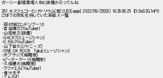 921: (ワッチョイW 1e11-+9dP) [sage] 2022/09/25(日) 21:15:23.79 ID:aU6E3l6d0 ガーシー劇場登場人物と結構かぶってんね 261 ホスフェニトインナトリウム(茸) [US][sage] 2022/09/25(日) 16:36:06.25 ID:3wS2G1nP0 ごぼうの党を支持していた芸能人一覧 ・田村淳(ロンドンブーツ) ・宮迫博之(YouTuber) ・山田孝之(俳優) ・GACKT(ミュージシャン) ・ヒカル(YouTuber) ・山下智久(ジャニーズ) ・ONE OK ROCK Taka(ミュージシャン) ・ボブサップ(格闘家) ・ピーターアーツ(格闘家) ・久保優太(格闘家) ・ラファエル(YouTuber) ・青汁王子 ・てんちむ http://egg.5ch.net/test/read.cgi/streaming/1663276565/921