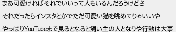 まあ可愛ければそれでいいって人もいるんだろうけどさ それだったらインスタとかでただ可愛い猫を眺めてりゃいいや やっぱりまで見るとなると飼い主の人となりや行動は大事
