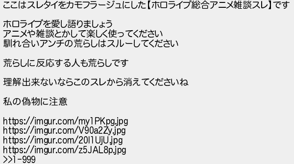 ここはスレタイをカモフラージュにしたホロライブ総合アニメ雑談スレです ホロライブを愛し語りましょう アニメや雑談とかして楽しく使ってください 馴れ合いアンチの荒らしはスルーしてください 荒らしに反応する人も荒らしです 理解出来ないならこのスレから消えてくださいね 私の偽物に注意