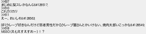 まじめに梨スレかなん これカリカリ えーおいしそ ぼくクレープ好きなんだけど弱者男性だからクレープ屋さんとかいけない焼肉太郎いこっかな えむえすえすおー!?