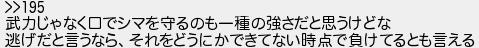 200: (ワッチョイW 6e81-LCrZ [113.41.136.106]) [sage] 2023/09/28(木) 14:42:41.52 ID:kaQjmWVU0 >>195 武力じゃなく口でシマを守るのも一種の強さだと思うけどな 逃げだと言うなら、それをどうにかできてない時点で負けてるとも言える http://egg.5ch.net/test/read.cgi/streaming/1695818708/200