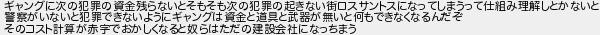 ギャングに次の犯罪の資金残らないとそもそも次の犯罪の起きない街ロスサントスになってしまうって仕組み理解しとかないと 警察がいないと犯罪できないようにギャングは資金と道具と武器が無いと何もできなくなるんだぞ そのコスト計算が赤字でおかしくなると奴らはただの建設会社になっちまう