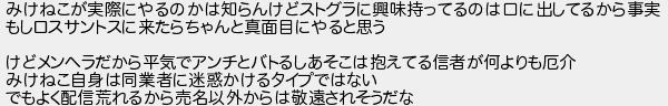 みけねこが実際にやるのかは知らんけどストグラに興味持ってるのは口に出してるから事実 もしロスサントスに来たらちゃんと真面目にやると思う けどメンヘラだから平気でアンチとバトるしあそこは抱えてる信者が何よりも厄介 みけねこ自身は同業者に迷惑かけるタイプではない でもよく配信荒れるから売名以外からは敬遠されそうだな