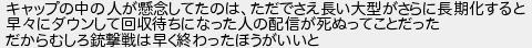 キャップの中の人が懸念してたのはただでさえ長い大型がさらに長期化すると 早にダウンして回収待ちになった人の配信が死ぬってことだった だからむしろ銃撃戦は早く終わったほうがいいと