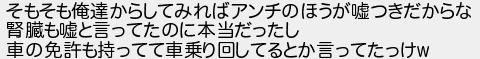 そもそも俺達からしてみればアンチのほうが嘘つきだからな 腎臓も嘘と言ってたのに本当だったし 車の免許も持ってて車乗り回してるとか言ってたっけ