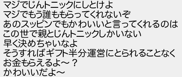 マジでじんトニックにしとけよ マジでもう誰ももらってくれないぞ あのスッピンでもかわいいと言ってくれるのは この世で親とじんトニックしかいない 早く決めちゃいなよ そうすればギフト半分運営にとられることなく お金もらえるよ? かわいいだよ
