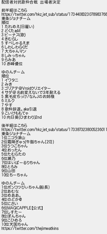 555: [] 2023/12/12(火) 12:53:28.35 ID:AoF/vWdU01212 配信者対抗歌枠合戦 出場者決定 前半組はこちら https://twitter.com/hkz_jet_sub/status/1734408323078983768 東条ジョナチーム 順位 1 たれめえ(日雇い) 2 どくたぁM 3 ビーナス(歌) 4 きむらし 5 すぺしゃるえま 6 しわしわらくだ 7 大ちゃんマン 8 しみっちゃん 9 らみあ 10 赤峰優位 ゆのんチーム 順位 1 イワタニ 2 みき 3 ゴリアテ@Vroidクリエイター 4 サダ@名前変えないで3年耐える 5 黒毛皮ちっけ/なんJのお姉様 6 ミルク 7 やす 8 歌枠辞退。aka引退 9 こいけももてゃ 10 向日葵(ひまわり)2nd 後半組はこちら https://twitter.com/hkz_jet_sub/status/1733873238005236011 東条ジョナチーム 1位ニコラ津山 2位霜降ぎゅぅ(牛脂ちゃん[20]) 3位うつこちゃん 4位おったん 5位たむらたの 6位瀬乃 7位はいぱーるりちゃん 8位とろみ 9位山田 10位ちーちゃん ゆのんチーム 1位ポンコツびぃちゃん(船長) 2位あむな 3位めああ。 4位のどか@ 5位にさい 6位MAGICAPPLE【公式】 7位しすたー 8位ぽんちゃん 9位こひめろ 10位天国ちゃん https://twitter.com/thejimwatkins http://egg.5ch.net/test/read.cgi/streaming/1700775708/555