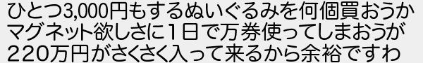 ひとつ円もするぬいぐるみを何個買おうか マグネット欲しさに1日で万券使ってしまおうが 220万円がさくさく入って来るから余裕ですわ