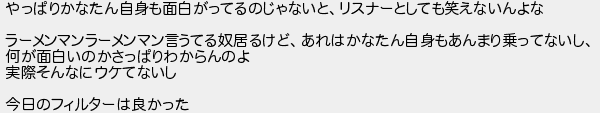 やっぱりかなたん自身も面白がってるのじゃないとリスナーとしても笑えないんよな ラーメンマンラーメンマン言うてる奴居るけどあれはかなたん自身もあんまり乗ってないし 何が面白いのかさっぱりわからんのよ 実際そんなにウケてないし 今日のフィルターは良かった