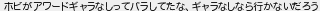 8: [sage] 2023/11/24(金) 12:50:56.15 ID:VUg2FnoM0 ホビがアワードギャラなしってバラしてたな、ギャラなしなら行かないだろう http://egg.5ch.net/test/read.cgi/streaming/1700775708/8