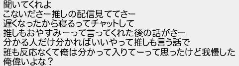 聞いてくれよ こないださー推しの配信見ててさー 遅くなったから寝るってチャットして 推しもおやすみーって言ってくれた後の話がさー 分かる人だけ分かればいいやって推しも言う話で 誰も反応なくて俺は分かって入りてーって思ったけど我慢した 俺偉いよな?