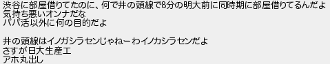 渋谷に部屋借りてたのに何で井の頭線で分の明大前に同時期に部屋借りてるんだよ 気持ち悪いオンナだな パパ活以外に何の目的だよ 井の頭線はイノガシラセンじゃねーわイノカシラセンだよ さすが日大生産工 アホ丸出し