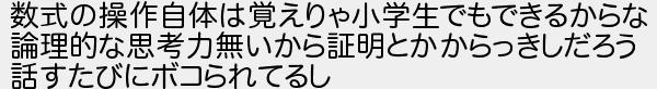 数式の操作自体は覚えりゃ小学生でもできるからな 論理的な思考力無いから証明とかからっきしだろう 話すたびにボコられてるし