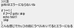 136: [sage] 2023/01/04(水) 04:29:15.97 ID:diYqjiE/ >>135 gotoはエラーにならないね if 1==1 ( if 2==2 goto :skip echo test1 :skip ) こんな感じでカッコの前にラベルおいてるとエラーになる http://mevius.5ch.net/test/read.cgi/tech/1663153441/136