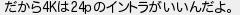 17: [] 2014/11/28(金) 21:06:35.34 ID:clInsP6W だから4Kは24pのイントラがいいんだよ。 http://kizuna.5ch.net/test/read.cgi/vcamera/1415836623/17